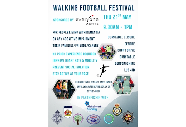 On Thursday 21 May partner agencies in Bedfordshire, together with Alzheimer’s Society, are hosting a Walking Football Festival to raise awareness of the support available for those living with dementia. The Herbert Protocol helps when someone living with dementia goes missing, by giving immediate access to vital information so the response can be timely and effective from the outset. In such cases timeliness is key, which not only saves time and effort but most importantly increases the opportunity to quickly and safely locate the individual. You can find out more and fill out a form for a friend or loved one on our website: People with dementia at risk of going missing (Herbert Protocol) The Walking Football event is being held at Dunstable Leisure Centre, Court Drive, Dunstable, LU5 4JD between 9.30am-1pm. This relaxed session is all about keeping active, connecting with others and enjoying sport in a supportive environment. No prior experience is needed, it is all about going at your own pace. For more information please contact David Lynch at Bedfordshire Fire and Rescue on david.lynch@bedsfire.gov.uk or 07748 140576. Visit our website for advice for carers of people with dementia at risk of going missing.