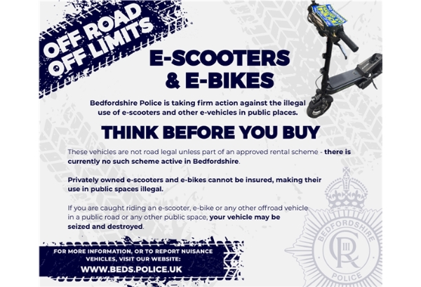 Bedfordshire Police is taking firm action against the illegal use of e-scooters and other e-vehicles in public places. Offenders risk prosecution, fines, driving disqualification, or imprisonment, and vehicles may be seized and destroyed if ownership or insurance cannot be proven. What you need to know: E-scooters and e-bikes are becoming increasingly popular gifts, especially for young people, but it’s vital to be aware of the legal risks before buying one. • Privately owned e-scooters and e-bikes cannot be insured, taxed, or put through an MOT, making their use in public spaces illegal. Protect your property: We’re taking action: Operation Skytree is our high-impact initiative tackling nuisance vehicles using police motorbikes and drones, covert and overt patrols, and intelligence-led investigations. Working closely with local authorities, the aim is to identify and disrupt nuisance riders across the county. Remember, unless a vehicle is specifically designed and registered for road use, it can only be ridden on private land with the landowner’s permission. If you notice nuisance vehicles in your area, you can report them by visiting www.beds.police.uk and providing details about the incident and the rider. | ||